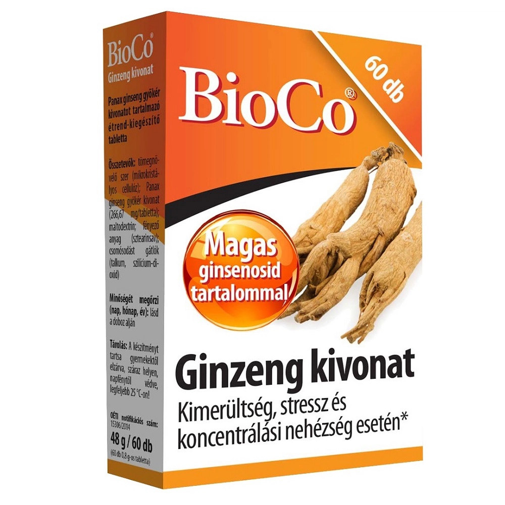 A BioCo Ginzeng kivonat készítmény napi ajánlott adagja 1 tabletta, bő folyadékkal kell lenyelni.