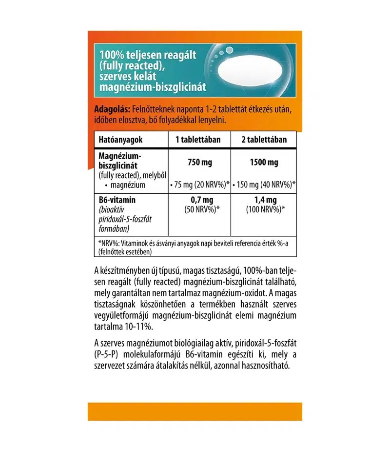 magnézium-biszglicinát (fully reacted/teljesen reagált formában), mikrokristályos cellulóz, zsírsavak, szilícium-dioxid, piridoxil-5-foszfát