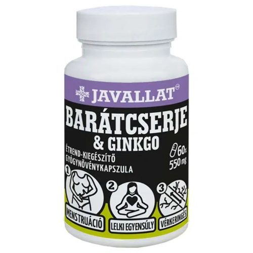 Javallat Barátcserje és Ginkgo – természetes gyógynövényalapú készítmény nők számára, kifejezetten a ciklus előtti és alatti időszak komfortérzetének és jó közérzetének támogatására. A barátcserje hozzájárulhat a hormonális egyensúly megőrzéséhez, míg a ginkgo elősegítheti a frissességérzetet és a koncentráció fenntartását.