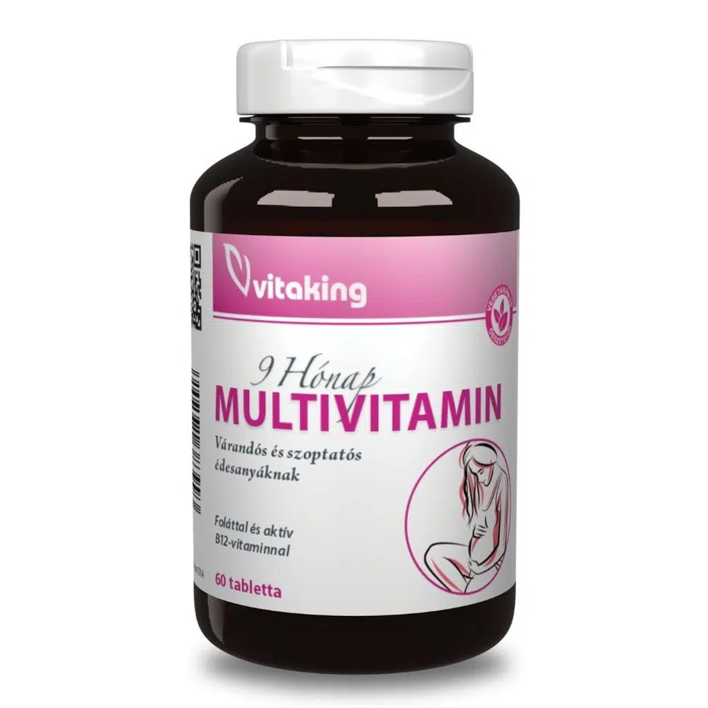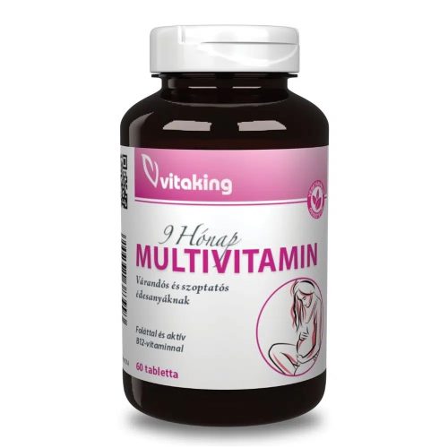 Vitaking 9 Hónap Multivitamin tabletta – 60db9 Hónap Multivitamin: Átfogó támogatás az anyasághozA 9 hónap multivitamin összesen 26-féle értékes összetevőt (vitaminokat, ásványi anyagokat és nyomelemeket) tartalmaz olyan mennyiségben, amellyel hatékonyan kiegészíthető a napi étrend a várandósság ideje alatt.Az a bizonyos 9 hónap egyértelműen az egyik legizgalmasabb időszak egy nő életében. Ebben a periódusban – sőt már a tervezés időszakában is – a kiegyensúlyozott táplálkozás és a tudatos mikrotápanyag-bevitel kiemelt fontossággal bír. Ez a készítmény komplex összetételével segíti a szervezetet ebben a különleges életszakaszban.A várandósság kimenetele és a baba egészsége több tényezőtől is függ, mint például az édesanya étrendjétől, életvitelétől, a szülők genetikai hátterétől, valamint a kismama fizikai állapotától. Mivel a terhesség első hetei kritikusak a magzati fejlődés szempontjából – amikor a kismama talán még nincs is tudatában állapotának –, a folyamatos tápanyagellátottság kulcsfontosságú.A változatos étrend és a mikrotápanyagok állandó jelenléte támogatja a fejlődő magzatot és az édesanya szervezetét is. A nem megfelelő táplálkozás a terhesség bármely szakaszában kihatással lehet a szervezet egyensúlyára.Miben segít a 9 hónap multivitamin?Napi egyetlen tabletta tartalmazza a szükséges vitaminokat és ásványi anyagokat abban a mennyiségben, amellyel célszerű kiegészíteni a napi étrendet:Anyai szövetek: A folát (folsav) a terhesség alatt részt vesz az anyai szövetek növekedésében.Immunrendszer és védelem: A C-vitamin hozzájárul az immunrendszer normál működéséhez, az E-vitamin pedig segíti a sejtek oxidatív stresszel szembeni védelmét.Idegrendszer: A B1-, B2-, B6- és B7-vitaminok támogatják az idegrendszer normál működését.Szív és keringés: A B1-vitamin hozzájárul a szív megfelelő működéséhez.Csontozat és fejlődés: A kalcium és a magnézium szükségesek a normál csontozat fenntartásához, a magnézium emellett szerepet játszik a sejtosztódási folyamatokban is.Struktúra: A C-vitamin támogatja a normál kollagénképződést, ezen keresztül az erek, a porcok és a bőr egészségét.Mikor ajánlott a készítmény alkalmazása?Tervezéskor és várandósság alatt: A szervezet vitamin- és ásványianyag-szükségletének kiegészítésére.A fejlődés támogatására: A magzati fejlődési folyamatok mikrotápanyagokkal való támogatásához.Vitalitás megőrzéséhez: A kismama szervezetének kiegyensúlyozott tápanyagellátottságához.Hatóanyagok 1 tablettában:A -vitamin – 1500mcgRE-5000NEC-vitamin – 250mgD3-vitamin – 10mcg-400NEE-vitamin – 20,1mgTE-30NEB1-vitamin – 25mgB2-vitamin – 25mgB3-vitamin – 50mgB6-vitamin – 25mgFolsav – 400mcgB12-vitamin – 50mcgPABA – 50mgInozitol – 15mgKolin – 15mgBiotin – 50mcgPantoténsav – 50mgKalcium – 50mgVas – 10mgFoszfor – 23mgJód – 150mcgMagnézium – 100mgCink – 15mgSzelén – 25mcgRéz – 2000mcgMangán – 5mgKróm – 100mcgMolibdén – 15mcgÖsszetevők:édesítőszer: szacharóz, aszkorbinsav, magnézium-oxid, dikalcium-foszfát, tömegnövelőszer: mikrokristályos cellulóz, d-kalcium-pantotenát, dl-alfa-tokoferil-acetát, kalcium-karbonát, nikotinamid, PABA, kolin-bitartrát, tiamin-mononitrát, vas-fumarát, stabilizátorok: (térhálós nátrium-karboxi-metil-cellulóz, hidroxi-propil-metil-cellulóz), riboflavin, piridoxin-hidroklorid, színezék: titánium-dioxid, maltodextrin, cink-oxid, retinil-acetát, csomósodást gátló anyagok: (szilícium-dioxid, zsírsavak magnézium sói, talkum), inozitol, mangán-szulfát, habzásgátló: polietilén-glikol, nedvesítőszer: polidextróz, réz-oxid, d-biotin, cianokobalamin, folsav, kolekalciferol, fényezőanyag: polyvinil alkohol, króm-klorid-hexahidrát, kálium-jodid, nátrium-szelenit, nátrium-molibdát-dihidrát.Felhasználási javaslat:A Vitaking 9 Hónap Multivitamin napi ajánlott adagja 1 tabletta, amit étkezés közben javasolt bevenni.