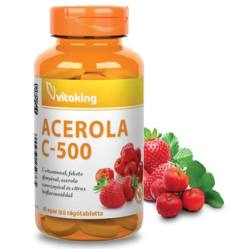 A Vitaking C-500 Acerola egy komplex, természetes forrásokat ötvöző étrend-kiegészítő. Az acerola cseresznye, a csipkebogyó, a fekete áfonya, a zöld paprika és a citrus bioflavonoidok erejével járul hozzá a szervezet napi C-vitamin ellátásához.